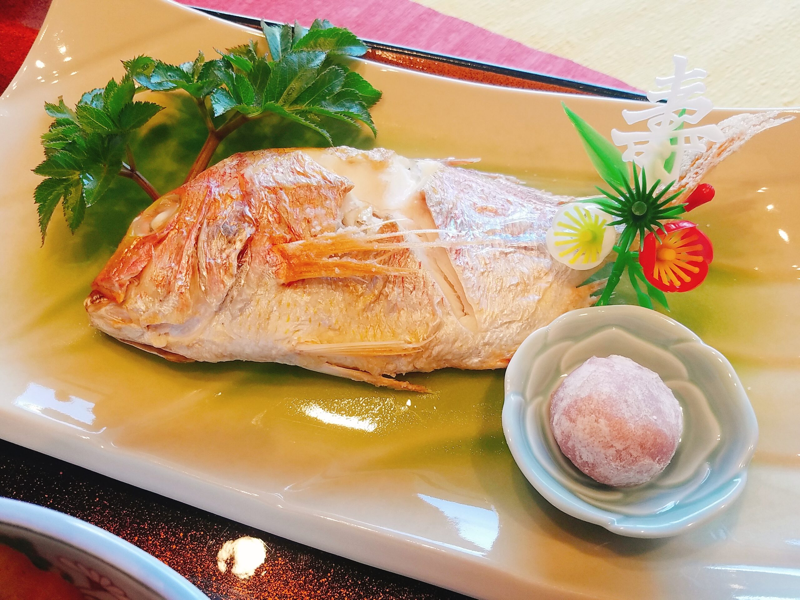 お食い初め膳には、尾頭付きの鯛、赤飯、煮物、香の物、吸い物などが並びます。