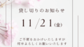 11/20(木) ランチ貸し切りのお知らせ 営業カレンダー 2025.11.19 【11/20(木)ランチお休みのお知らせ】 いつも「お食事処やまに」をご利用いただき、誠にありがとうございます。 11月20日(木)は、夜のご宴会準備のため、ランチ営業をお休みさせていただきます。 ご来店を予定してくださっていた皆さまには、ご不便をおかけしてしまい申し訳ございません。夜はお祝いのお席を心をこめてお支度させていただきます。 またのご来店を、女将・大将ともに心よりお待ちしておりますどうぞよろしくお願いいたします。