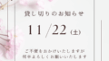 11/23(日) ご宴会の為ランチお休み 営業カレンダー 2025.11.22 【11/23(日)ランチお休みのお知らせ】 いつも「お食事処やまに」をご利用いただき、誠にありがとうございます。 11月23日(日)は、昼夜のご宴会のため、ランチ営業をお休みさせていただきます。 ご来店を予定してくださっていた皆さまには、ご不便をおかけしてしまい申し訳ございません。ご予約の皆様のお席を心をこめてお支度させていただきます。 またのご来店を、女将・大将ともに心よりお待ちしておりますどうぞよろしくお願いいたします。