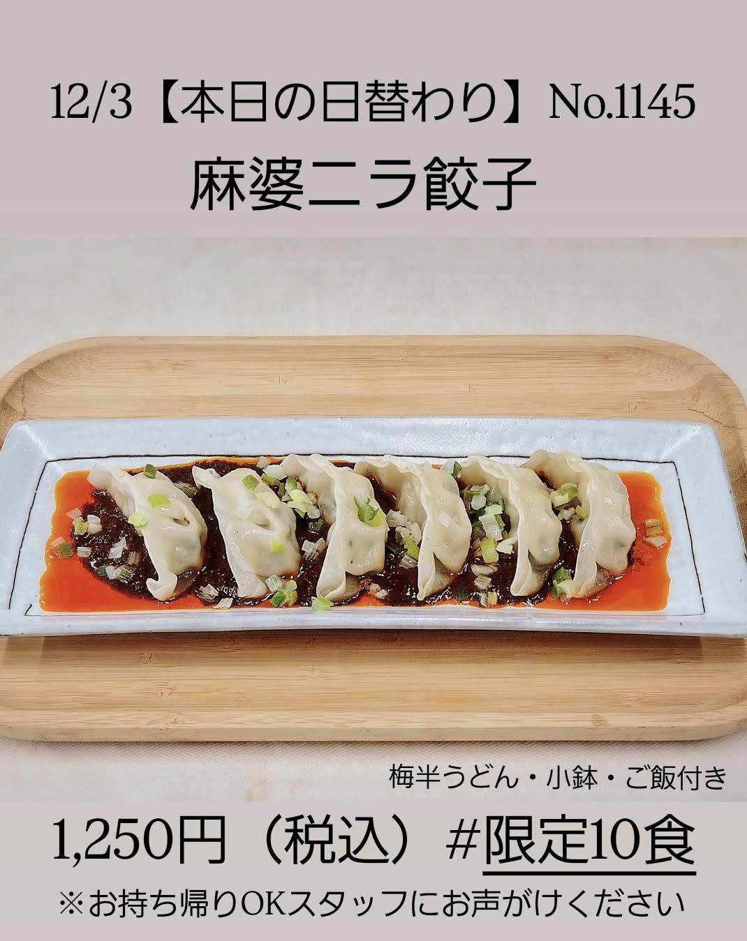 2025年12月3日 今日の日替わり 日替わりランチ 2025.12.03 【本日の日替わり】No.1145 おはようございます やまに女将です 麻婆ニラ餃子 餃子といえば、酢醤油・酢こしょう・ぽん酢… つけダレの楽しみ方はいろいろありますが、今日はさらに一歩先へ! やまにでは、ピリ辛の麻婆ダレをたっぷり絡めた “麻婆ニラ餃子”をご用意しました。 じんわりスパイスが効いた麻婆ダレに、ニラの香りがふわっと広がり、 身体の中からぽかぽか温まる冬ランチです。 いつもの餃子とは一味違う、元気が出る味わい。 ぜひほかほかのうちにお召し上がりください。