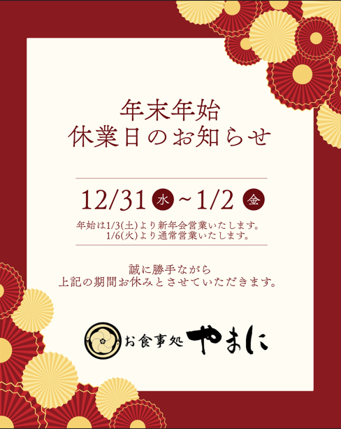 いつも「お食事処やまに」をご利用いただき、誠にありがとうございます。