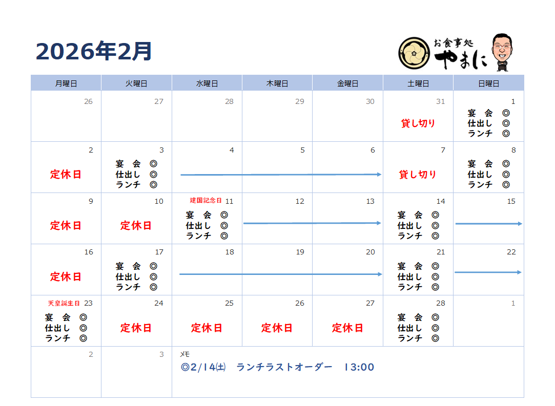 2月はご宴会や仕出しのご予約が多く、営業日が変則的になっております。