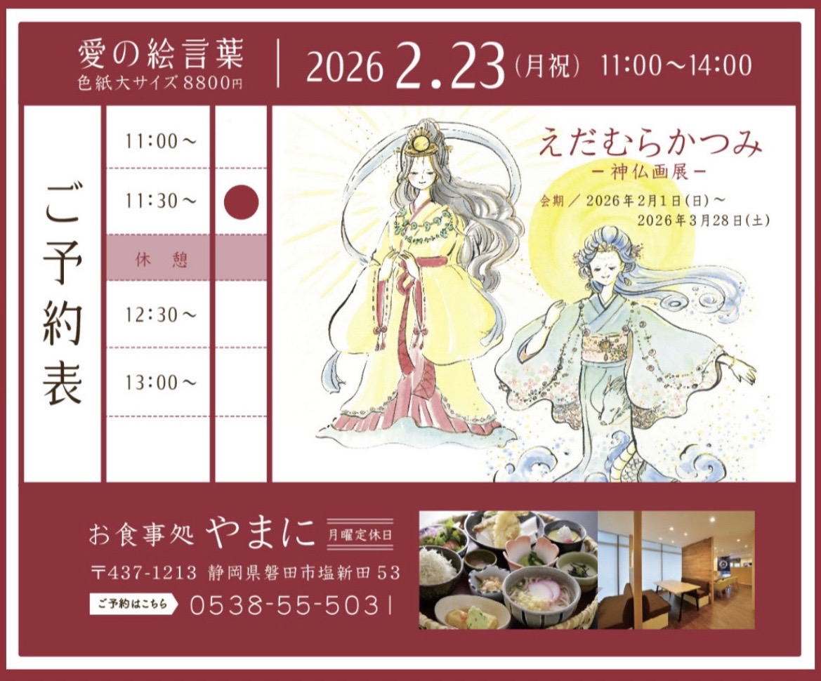 明日2月23日(月・祝)、えだむらかつみさんご本人がやまに2F大広間に来てくださいます。ランチをご利用のお客様限定で、その場で直筆の「愛の絵言葉」を書いていただける、またとない特別なイベントです。ご予約は不要ですので、お気軽にお越しください。