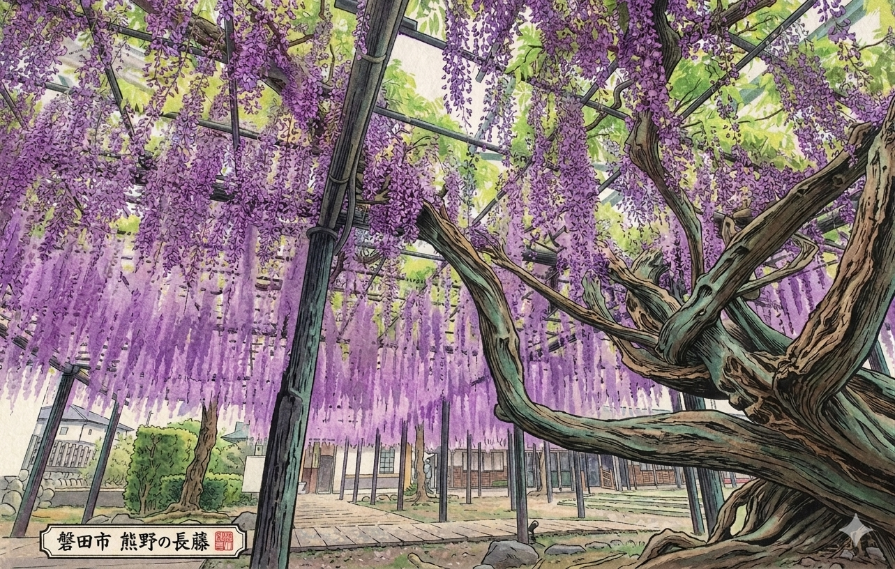 磐田市二之宮にある行興寺は、樹齢1,000年を超えるとも言われる藤の木で知られる名所です。例年4月下旬から5月上旬にかけて「熊野の長藤まつり」が開催され、国の天然記念物にも指定された見事な藤の花が訪れる人々を迎えます。紫色の藤の房が垂れ下がる光景は、遠州を代表する春の風物詩のひとつ。県内外から多くの方が足を運ぶ、磐田の誇る観光スポットです。