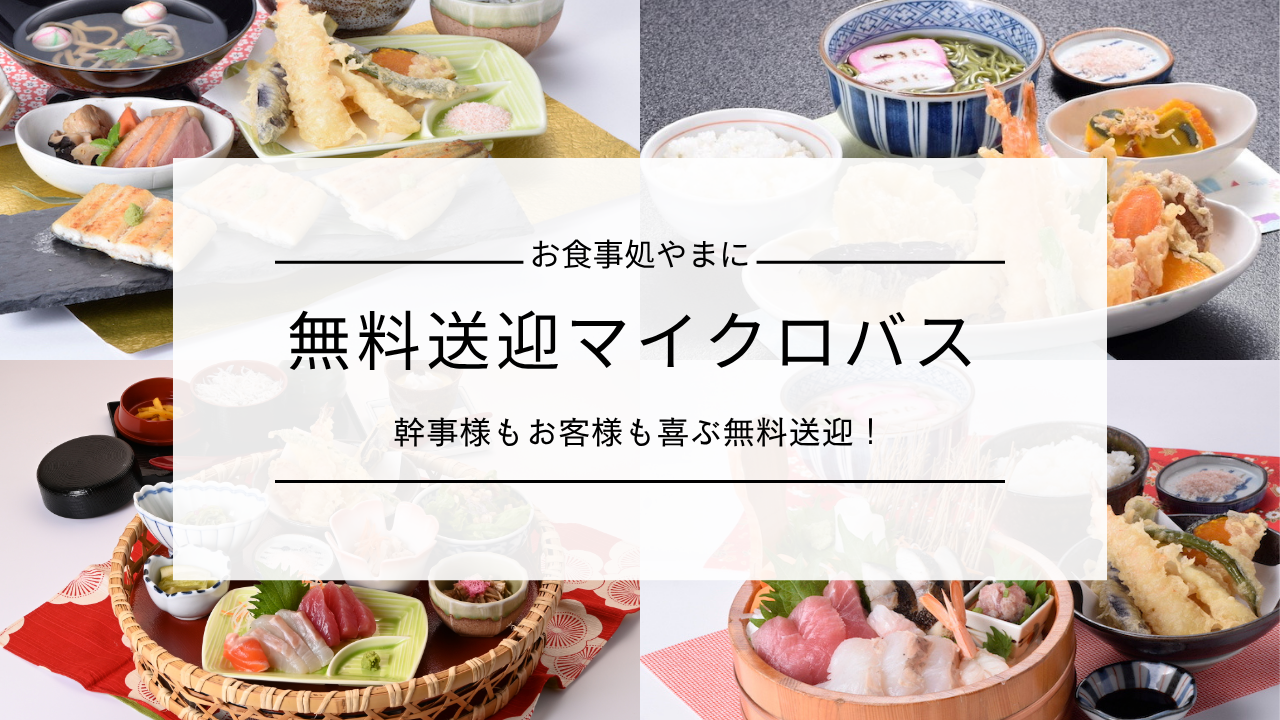 お食事処やまにでは、28名乗りのマイクロバスによる無料送迎サービスを提供しています。